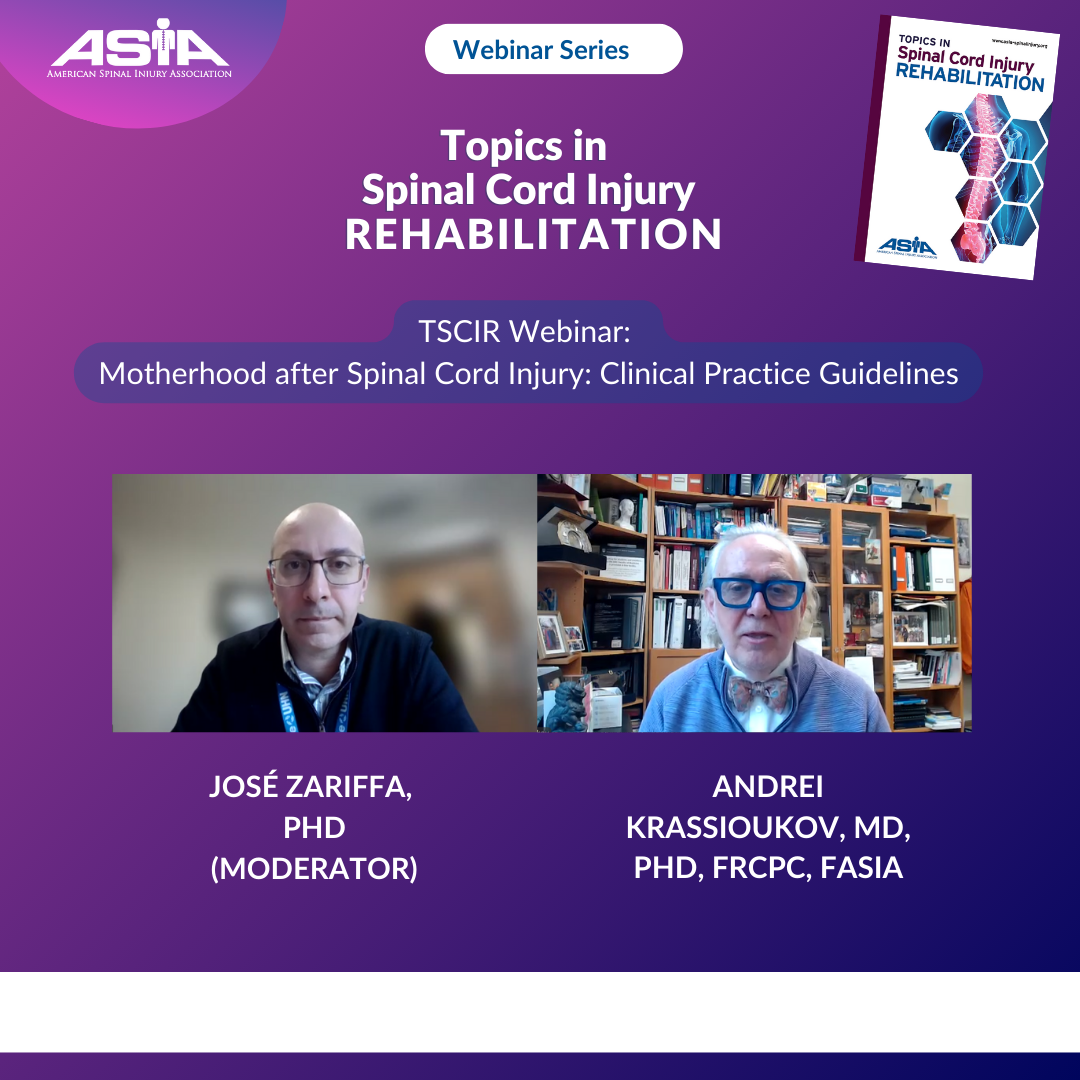 Jan. 2026 TSCIR Webinar ASIA Past President Andrei Krassioukov, MD, PhD, FRCPC, FASIA, hosted a TSCIR webinar: Motherhood after Spinal Cord Injury: Clinical Practice Guidelines. The webinar was moderated by: José Zariffa, PhD, TSCIR Associate Editor