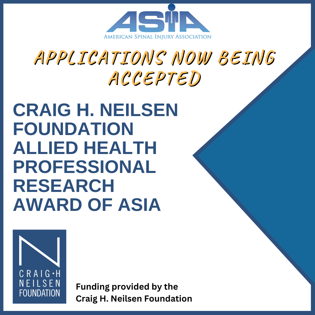 Applications are now being accepted for the 2026 Craig H. Neilsen Foundation Allied Health Professional Research Award of ASIA. The CHNF Allied Health Professional Research Award of ASIA is to encourage clinicians with an interest in research, but who have limited experience in research thus far in their career – fostering the transition of the applicant from a clinician into becoming a researcher.