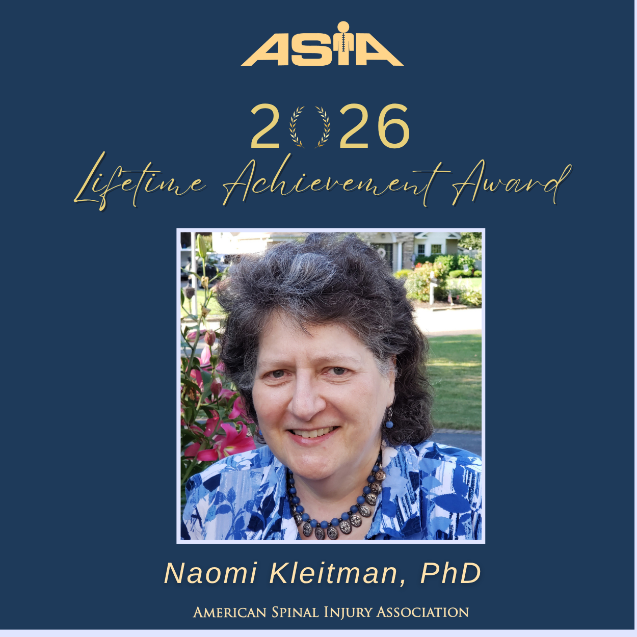 The American Spinal Injury Association is excited to announce Naomi Kleitman, PhD as the recipient of the 2026 ASIA Lifetime Achievement Award. The Lifetime Achievement Award is the highest honor bestowed by ASIA to an individual recognized for significant contributions to the world of spinal cord injury care. Naomi Kleitman, serves as Senior Vice President of Grants and Research, for the Craig H. Neilsen Foundation. Dr. Kleitman will be honored during ASIA’s Annual Meeting in San Antonio,