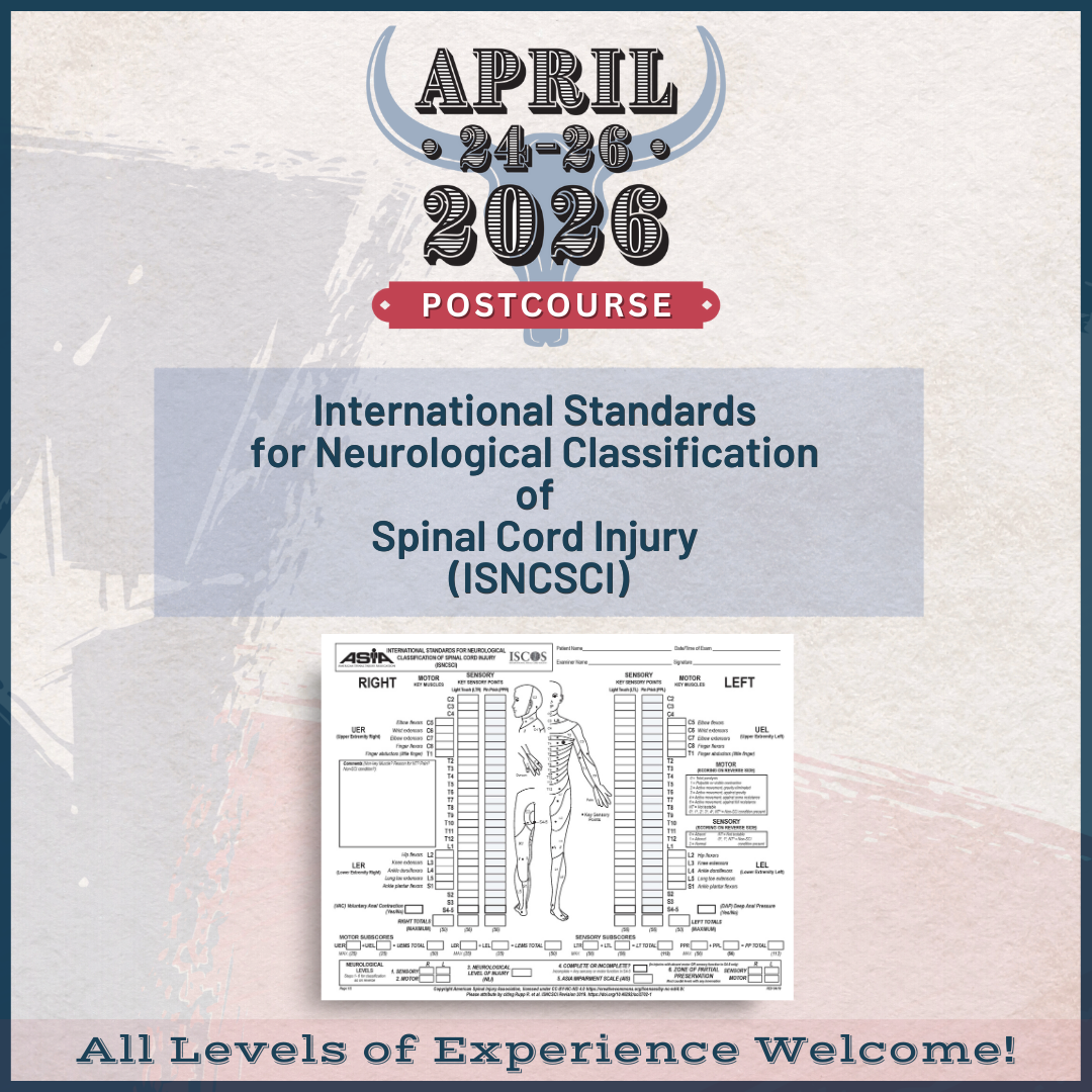 Register for the ASIA 2026 ISNCSCI postcourse to learn more about performing the ISNCSCI exam or to enhance your accuracy. The International Standards for Neurological Classification of Spinal Cord Injury (ISNCSCI) represents the most widely used system for the characterization of sensorimotor impairments after spinal cord injury (SCI). Sign up for the ISNCSCI postcourse in the ASIA 2026 registration portal online here.